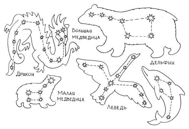 Дети вспоминают, как они наблюдали за звездами и отмечали, что звезды расположены группами – созвездиями (рис. 1). Воспитатель рассказывает, что давным-давно люди заметили, что расположение звезд напоминает им очертания некоторых животных. Показывает картинки с изображением созвездий и их названиями – Большая и Малая Медведицы, Жираф, Лебедь, Дракон, Лев. Дети рассматривают их, устанавливают сходство в названии созвездия и его изображении.