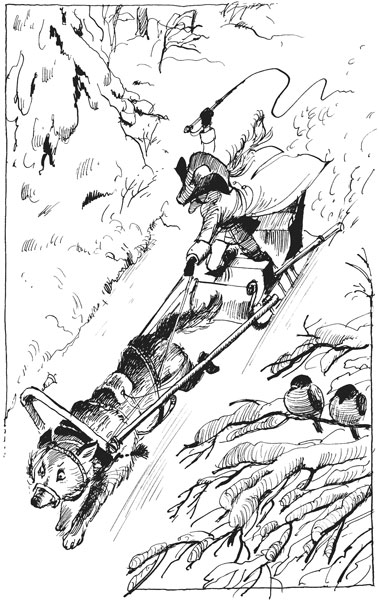 Благополучно избежав неминуемой гибели, я тихонько приподнял голову и с ужасом увидел, что голодный зверь проглотил всю заднюю часть животного. Я изо всей силы огрел его кнутом. Волк от испуга и боли рванулся вперёд и очутился вместо лошади в её упряжи и оглоблях. К великому удивлению встречных, волк бешено мчал меня и скоро благополучно привёз в Петербург.