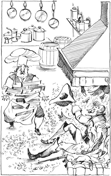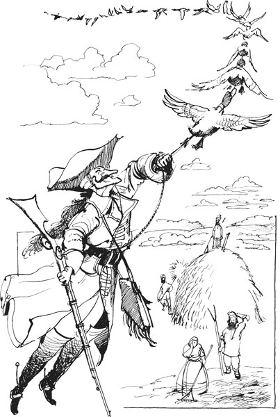 Когда я свернул голову последней утке, то находился как раз над дымовой трубой моего дома, и так как утки, лишившись голов, не могли летать, я медленно начал спускаться и через дымовую трубу попал прямо в свой камин. Я, к большому испугу моего повара, вышел из камина как раз в тот момент, когда он собирался развести огонь. И опоздай я ещё на пять минут, я бы не выбрался оттуда невредимым. Испуг повара сменился радостью, едва он увидел, кроме хозяина, богатый подарок для своей сковороды – диких уток.