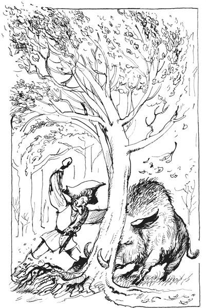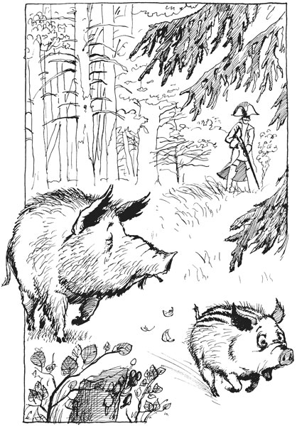 Раздражённый кабан ринулся за мной и ударил клыками о ствол дерева с такой силой, что они глубоко впились в дерево и концы их прошли насквозь. Он начал метаться во все стороны, стараясь освободить свои клыки. Я проворно соскочил на землю, камнем загнул концы клыков и вколотил их в ствол. В таком положении я оставил кабана в лесу, а сам отправился домой в полной надежде, что он никуда не уйдёт. Дома я хорошо поужинал и лёг спать.
