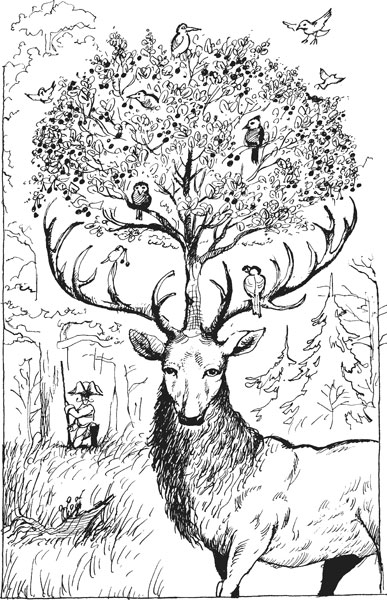 Через два года мне пришлось опять охотиться в тех лесах. Вдруг вижу: бежит прямо на меня красивый олень с вишнёвым деревом между рогами. Невольно я вспомнил о своём прежнем приключении.