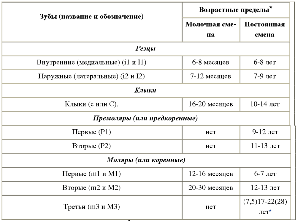 Неодновременность связана с тем, что в нижней челюсти клык обычно появляется раньше премоляров, а в верхней – позже. Постоянные зубы нижней челюсти появляются немного раньше, чем зубы верхней челюсти. Длительность прорезывания отдельных зубов так же различна: самым долгим этот период бывает у вторых премоляров, а наиболее коротким – у первых моляров и первых резцов.