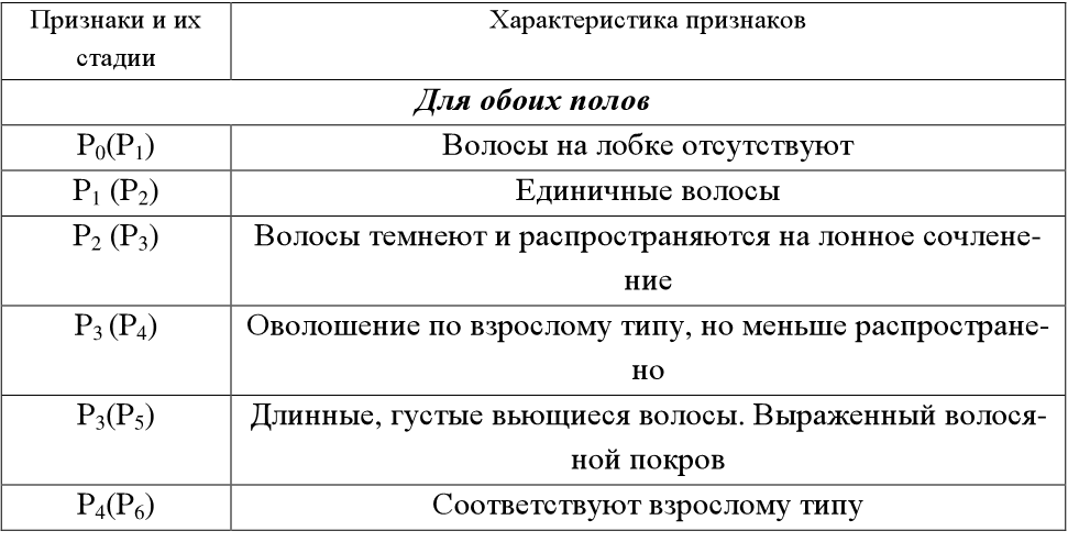 1. степень развития лобковых волос (Р – pubis), с градациями от Р0 – волосы на лобке отсутствуют, до Р4 – распространение волос соответствует взрослому (Штефко В.Б., Островский А.Д., 1929). В схеме Дж. Тэннера (1969) степень развития волос на лобке описывается по более подробной шкале (Р1 – Р6). (таб.2.3.)