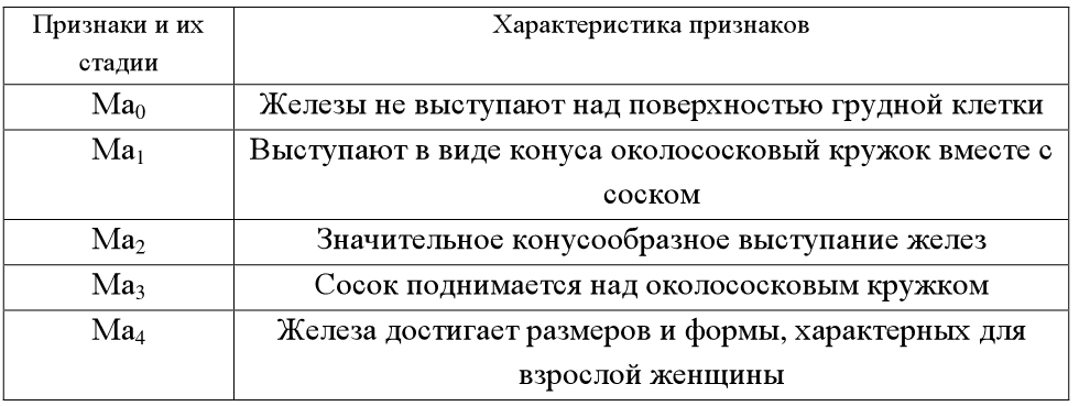– развитие грудных желез и соска (Ма– mammae) с четырьмя степенями развития от Ма0 до Ма4, (по В.Б. Штефко и А.Д. Островскому);