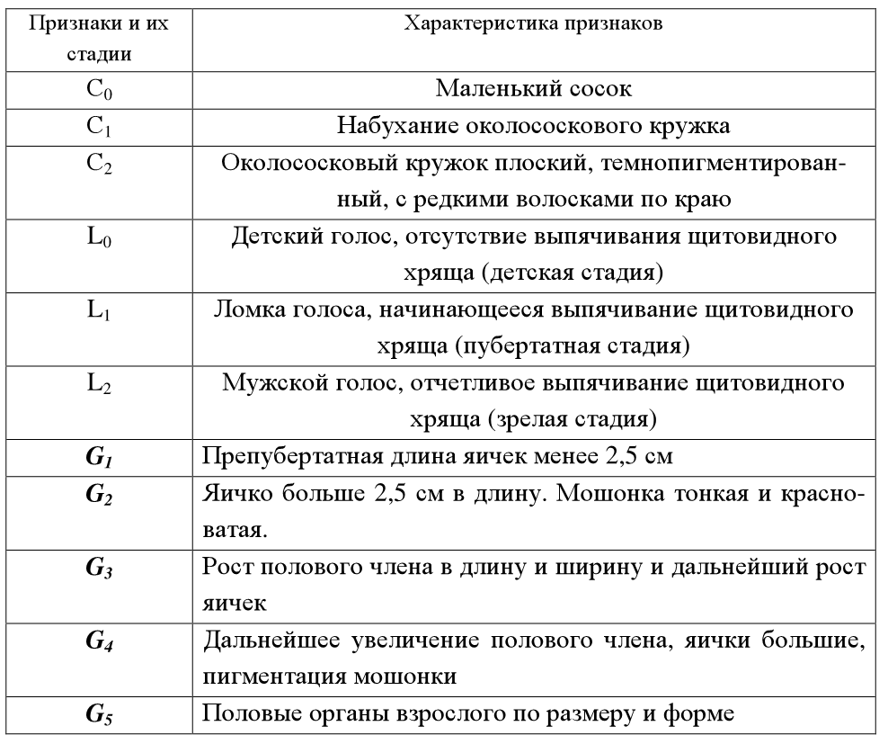 у мальчиков и юношей – G-C-P-Ax-L (плюс волосы на лице и на теле).