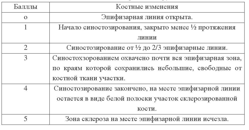 При анализе степени оссификации трубчатых костей пользуются схемой, предложенной Полушкиной Л.Е., Никитюком Б.А., Бевзюком В.В (табл. 2.2.).