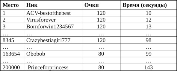 Тем более обидно, что я так безнадёжно отстал от победителя со звучным ником ACV-bestofthebest5, который прошёл первый уровень всего за десять секунд против моих девяноста девяти и, в отличие от меня, не терял жизнь, поэтому и набрал сто двадцать очков против моих восьмидесяти! Да, на моём месте сказалась «потерянная жизнь» (она мне стоила сорока очков), но если бы даже я её не потерял, то всё равно был бы далеко от топа, на 8 346-м месте, сразу за какой-то девчонкой под ником Crazybestiagirl777!