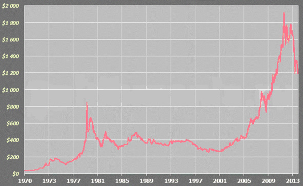 Рис. Цена на золото с 1970-го по 2014-й год за унцию.