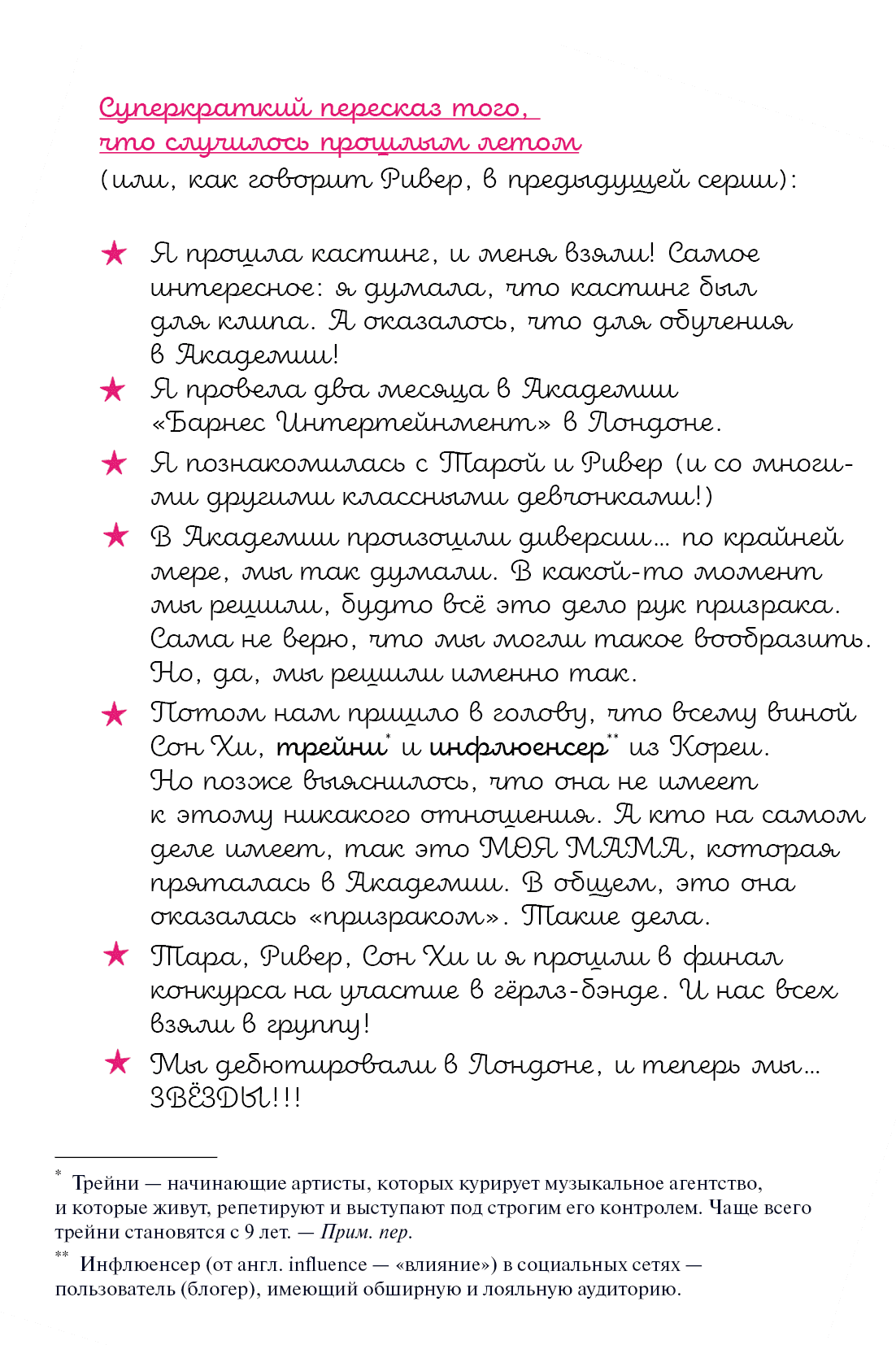 Она знала, что Таре больше всего нравилось петь, но не очень нравилось танцевать. В отличие от неё самой: для Алисы всё было как раз ровно наоборот. Сильный голос был у Сон Хи, а вот Ривер, пожалуй, лучше танцевала. Хотя ни одна из них не отдавала предпочтение какой-то из этих дисциплин. Но главное, все они любили разное! Разные стили, разную музыку, разную манеру двигаться. Смогут ли они договориться, чтобы создать что-то общее? А вдруг не смогут?!