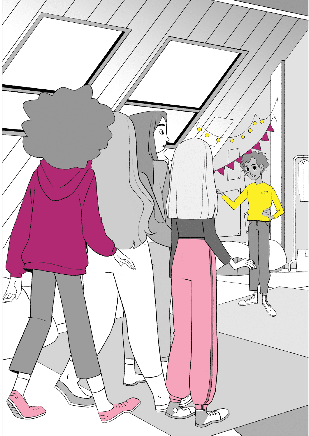 Девочки последовали за ним. Коридор не был прямым. Через несколько метров компания свернула направо, и глазам друзей открылось гигантское пространство. Это был по-настоящему огромный чердак. По центру комнаты потолок казался достаточно высоким, но чем ближе к полу, тем ниже он становился. Через световые люки в стенах проникали лучи солнца, которые освещали беспорядочно разбросанные повсюду вещи. Там были какие-то ковры, манекены, одетые в умопомрачительные пальто и наряды, какие-то удивительные музыкальные инструменты… В дальнем конце помещения под одним из микроскопических окошек располагались письменный стол и кровать. По-видимому, это и был уголок Тони.