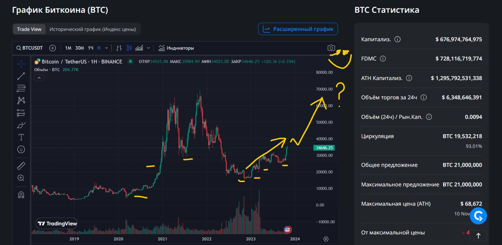Не понимаете, о чём я? Давайте я покажу вам на графике биткоина с 2020 по конец 2023 года. То, что вы видите к концу 2023 года – это далеко не конец (далеко не «пик» рынка). Биткоин будет расти – это неизбежность, поэтому есть повод ЗАДУМАТЬСЯ, и взять перспективный актив заранее – ДО ПИКА. На «хаях» (в верхних значениях) мы будет фиксировать прибыль, а не покупать! Горизонтальные оранжевые подчёркивания – ориентиры, где я покупал БИТКОИН – это позиция «усреднения». Теперь у меня достаточный запас BTC.
