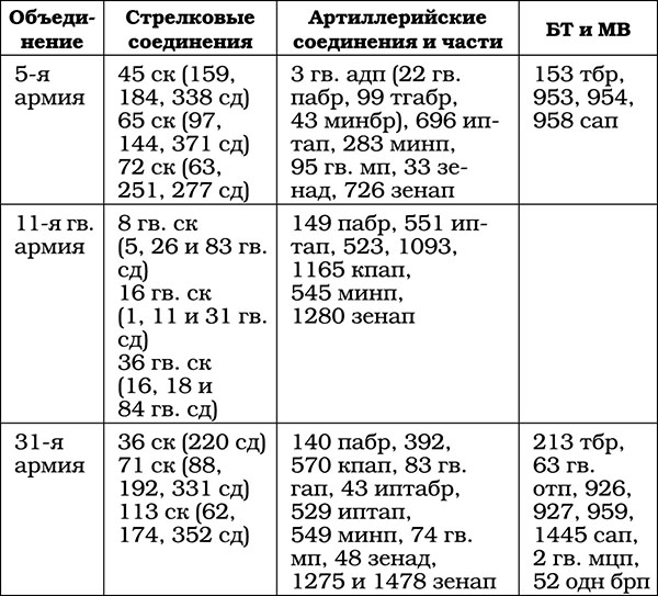 В это время войска центра и левого крыла фронта должны были прочно удерживать занимаемые ими рубежи обороны, препятствуя противнику снятие частей с этих участков и их передислокацию в другие районы активных боевых действий.