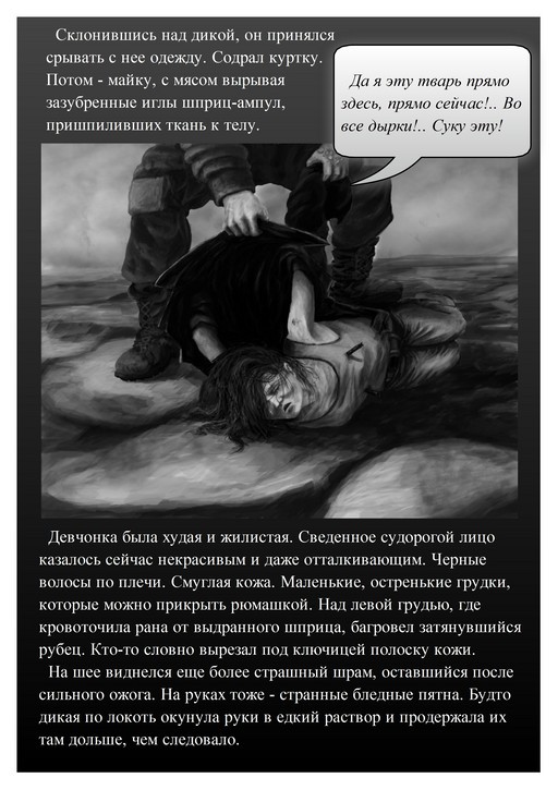 Из одежды на дикой были только трусики и стянутые ниже колен узкие джинсы. Куртка и майка лежали в стороне. Изо рта стекала струйка пены. На смуглой коже виднелись кровоточащие раны от выдранных игл и следы от тяжелых ботинок Гвоздя. Ну и конечно, шрамы. На шее, на груди. Пятна на руках. Все-таки, немножко подпорченным оказался товар.
