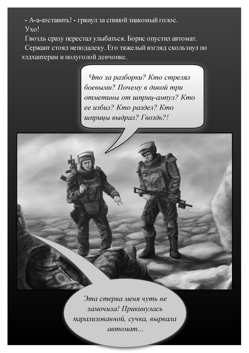 Стольник терпеливо ждал. Наблюдал. Изучал. Взводный стоял над пленницей, расставив ноги и чуть склонив голову. Вокруг толпились хэдхантеры. Со всех сторон сыпались скабрезные шуточки. Борис даже пожалел чернявую. Сейчас, в окружении ухмыляющихся мужиков скрюченная параличем девчонка с пластиковыми кольцами на руках и ногах казалась ему особенно беспомощной и беззащитной.