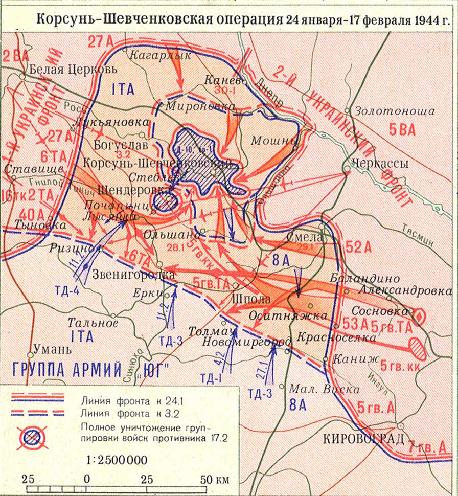 24 января 1944 г. началась Корсунь-Шевченковская наступательная операция и уже 28 января клещи сомкнулись у Звенигородки. В окружении оказались более десяти вражеских дивизий. Маршалл Г.К. Жуков, как всегда, уделил серьезное внимание укреплению внешнего кольца окружения. И фельдмаршал Э. Манштейн не замедлил себя ждать – бросился вызволять отрезанные войска из «котла». Однако, эта попытка не увенчалась успехом – мастерство наших командиров и храбрость солдат позволили отбить все атаки извне. Положение окруженных вражеских войск становилось безнадежным, тем не менее 9 февраля они отклонили ультиматум о сдаче. После этого родилась знаменитая фраза Сталина: «Если враг не сдается, его уничтожают». И враг был почти полностью уничтожен – в боях погибло 55 тыс. солдат и офицеров противника, в том числе и командующий окруженной группировки генерал В. Штаммерман. В плен было взято 18 тыс. и боевая техника этой группировки. В приказе от 23 февраля 1944 г. Сталин назвал эту блестящую операцию «новый Сталинград на правобережье Днепра».
