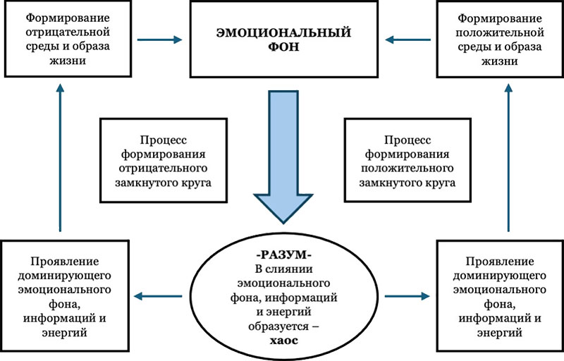 После продолжительных практик и наблюдений оказалось, что устранение данных причин не приводит к желаемой жизни. Проверяя данную теорию на своем опыте, мы убедились, что не учитывали одну причину, оказывающую негативное влияние в виде «хаоса разума», – наш эмоциональный фон. Действительно, устранив рациональную причину, мы лишь на время удовлетворяем свое внутреннее состояние, но через короткий промежуток времени мы снова ощущаем негативное влияние отрицательного «хаоса разума» и начинаем искать причины и способы удовлетворения своих желаний для стабилизации эмоционального состояния.