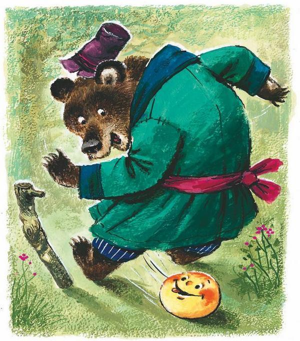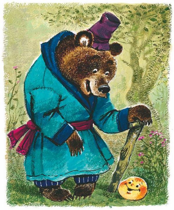 Катится колобок по лесу, а навстречу ему медведь идёт, хворост ломает, кусты к земле гнёт.