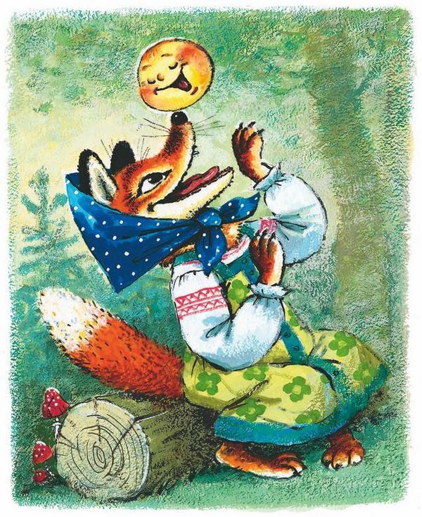 Колобок обрадовался, что его песенку похвалили, прыгнул лисе на мордочку да и запел:
