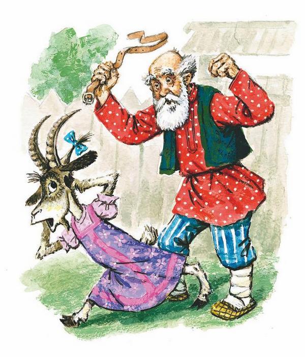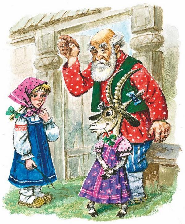 Жили-были дед да баба да внучка Маша. Не было у них ни коровки, ни свинки, никакой скотинки – одна коза. Коза, чёрные глаза, кривая нога, острые рога. Дед эту козу очень любил. Вот раз дед послал бабку козу пасти. Она пасла, пасла и домой погнала. А дед сел у ворот да и спрашивает: