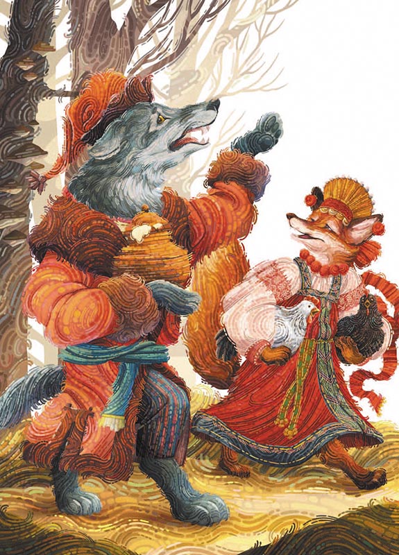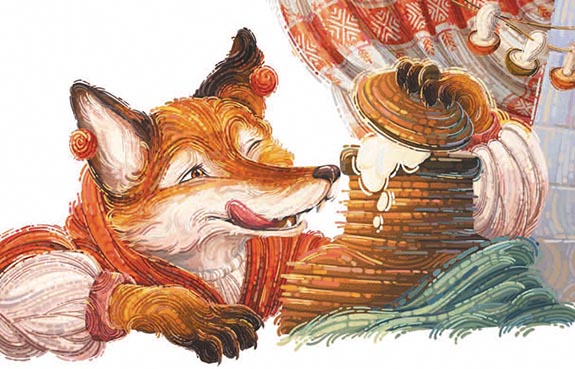 Волк пробежал половину деревни, и послышался ему лай собаки, запертой в избе; он проскакал деревню и остановился за погребом. Видит, что нет за ним никакой погони, что в деревне нет ни шуму, ни гаму и лиса-кумушка никакой вести ему не даёт; волк тихохонько отворил погреб, схватил кринку масла[2] и был таков. Пришли домой, зажарили добычу, съели и легли отдыхать.