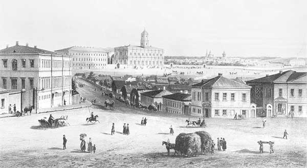 Сцена боровицкого начала воспроизводится настолько, что Николаевский и Ярославский вокзалы заняли высокий берег площади, Казанский – низкий.