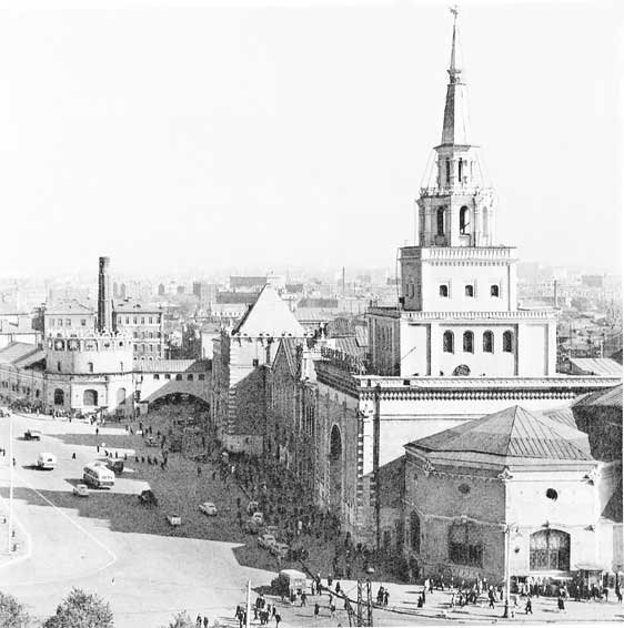 Но Шестивратная разобрана за полтораста лет до Щусева, ее явившаяся на вокзалах тень доказывает важность своего оригинала на старом месте, в панораме набережного Замоскворечья. Правда, Шестивратная была о двух шатрах, ее одноверхая тень брошена на Каланчевку словно от бокового света. Так, в ракурсе, сближающем шатры, башня смотрелась вдоль Москвы-реки.