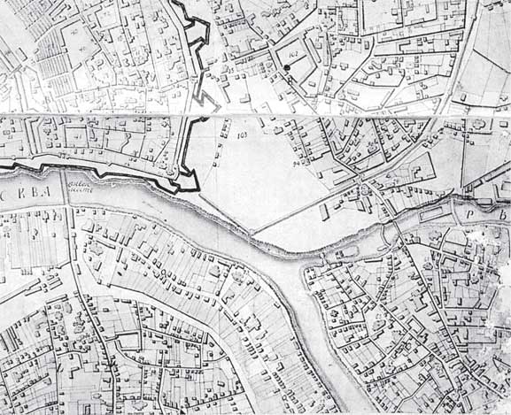 Васильевский луг и устье Яузы на плане Москвы С. М. Горихвостова. 1767–1768. Стена Белого города пересекает луг и поворачивает к стене Китай-города. За которой, параллельно реке, идет к Кремлю Мокринский переулок