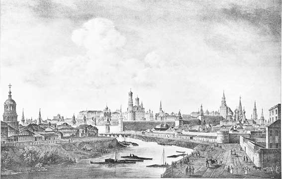 Вид на Москву с балкона Кремлевского дворца в сторону Москворецкого моста. Гравюра с оригинала Ж. Делабарта. 1790-е. Фрагмент. В глубине – Воспитательный дом, каким его увидит с этого места Наполеон