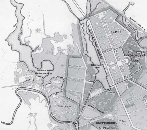 Устье Сходни (слева) и устье канала «Волга – Москва» на Генеральном плане 1935 года. Оба устья пересекает Волоколамская дорога. Сходня по проекту запруживается