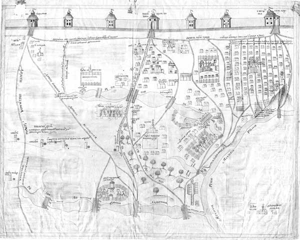 План земли за Земляным городом от Тверских до Смоленских ворот. Чертеж 1680-х. Ориентирован на восток. В центре стены Земляного города – башня Никитских ворот. От нее лежит Волоцкая дорога, пересекающая речки Пресню и Ходынку. У пересечения с Ходынкой ответвляется к Тверским воротам новая Волоцкая дорога. В центре чертежа – церковь Николы в Новом Ваганькове, или на Трех Горах