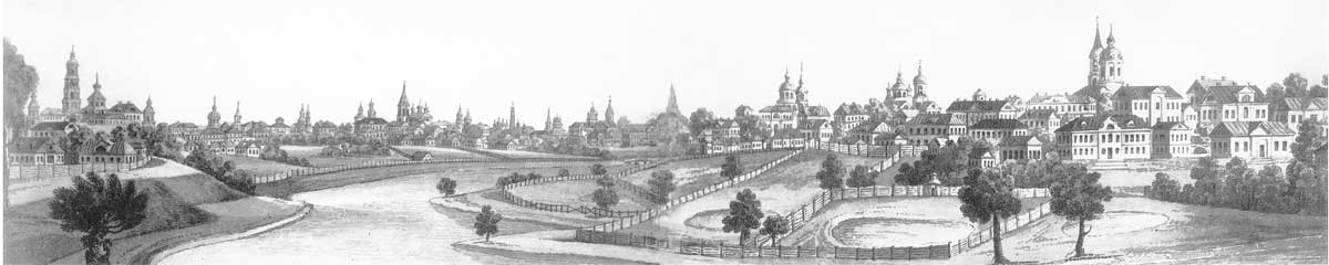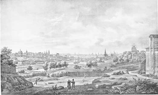 О.-А. Кадоль. Вид внутренней части Москвы. 1825. Вид долины Яузы, снятый от предполагаемого места Воронцовского дворца