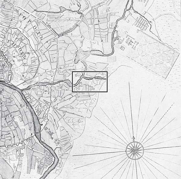 Яуза и ее окрестности на плане Москвы И. Ф. Мичурина. 1730-е. При впадении Золотого Рожка (в центре фрагмента) – Андроников монастырь. Выше по Яузе – Лефортовский дворцово-парковый комплекс