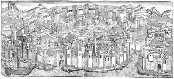 Константинополь. Немецкий рисунок. 1493. Справа – устье Золотого Рога и огражденная Галата