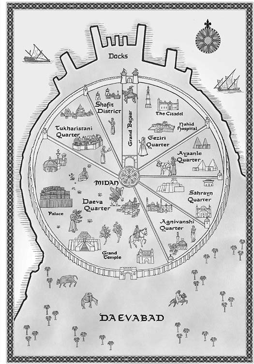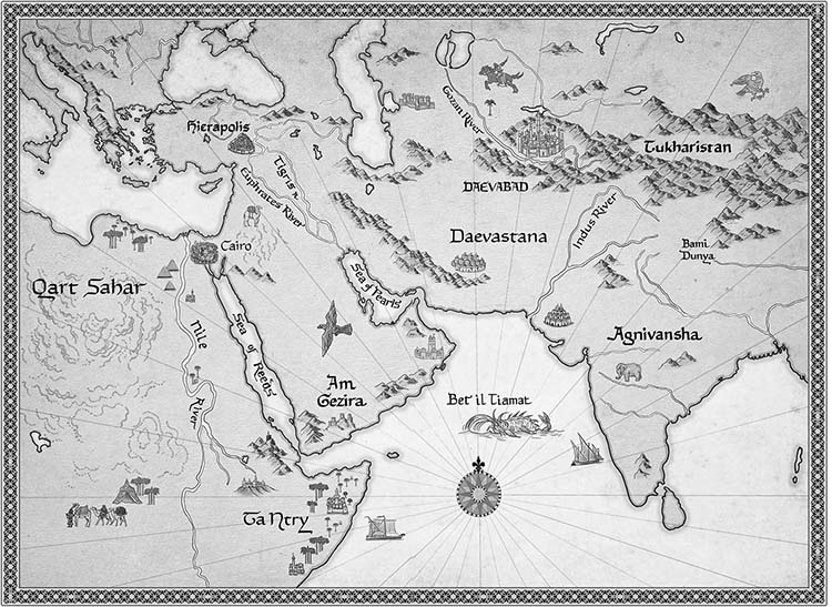 “A long time I’ve waited to look upon Anahid’s city.” There was cruel triumph in his voice. “But it’s not quite the paradise of the songs. Where are the shedu rumored to patrol the skies and the gardens of jeweled trees and rivers of wine? The fawning marid servants conjuring rainbows of waterfalls and a library teeming with the secrets of creation?”