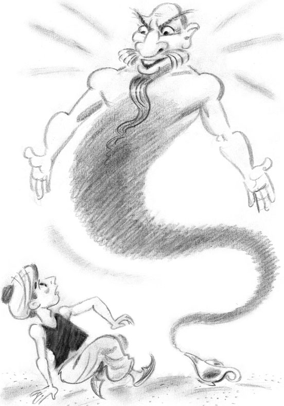 Aladdin rubbed the Lamp. The Jinn appeared and asked, “What is your will?”