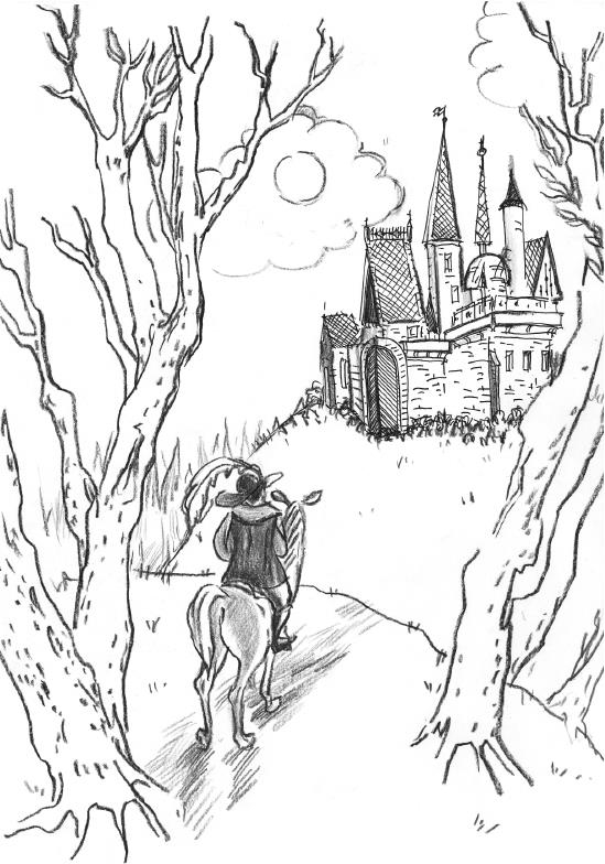 He was not far from his own house, thinking on the pleasure he should have in seeing his children again, when going through a large forest he lost himself[11]. It rained and snowed terribly, and the wind was so high that it threw him twice off his horse[12], and he heard wolves’ howling all round him. Suddenly he saw a light at some distance. It came from a palace illuminated from top to bottom. The merchant thanked God for this happy discovery and hastened to the place, but he was greatly surprised at not meeting with anyone in the outer courts. His horse followed him and, seeing a large stable open, went in and, finding both hay and oats. The poor beast, who was almost famished, started to eat greedily. The merchant tied him up to the manger and walked towards the house, where he saw no one. Entering into a large hall, he found a good fire and a table plentifully set out with but one cover laid[13]. As he was wet quite through with the rain and snow, he drew near the fire[14] to dry himself. “I hope,” said he, “the master of the house or his servants will excuse the liberty I take; I suppose it will not be long before some of them appear.”