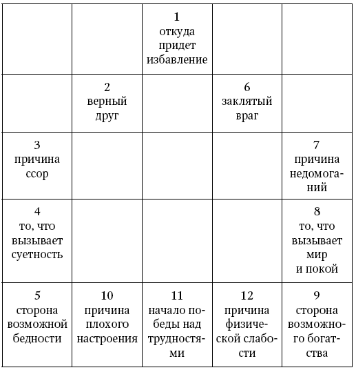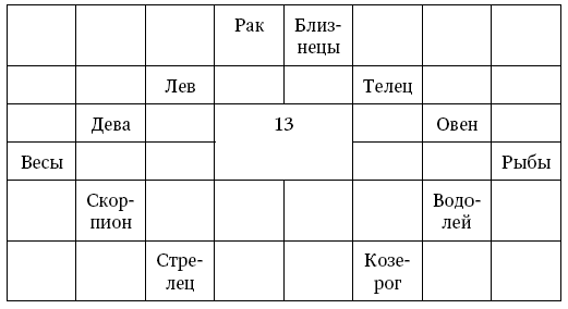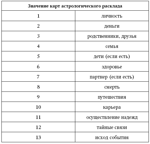 В данном раскладе каждая карта перекликается с определенным знаком Зодиака. Карты выкладываются по кругу против часовой стрелки; начинать нужно с той позиции, которая соответствует знаку Зодиака вопрошающего (или того, на кого совершается гадание). Последняя 13-я карта кладется в середину и открывается последней.