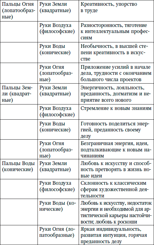 Рука Огня с квадратными кончиками пальцев предполагает творческую, но стабильную натуру (уравновешенность обеспечивает лопатообразная ладонь).