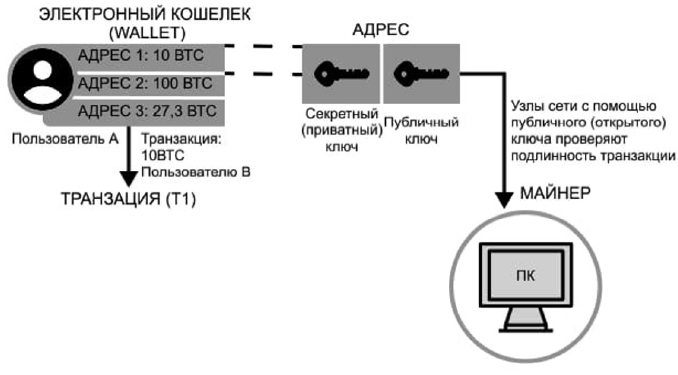 Как это реализуется? У вас есть один секретный ключ – это ваш кошелек, и множество публичных ключей, которые вы можете использовать при взаимодействии с другими людьми (рис. 2). Вы можете использовать каждый раз разные адреса, что позволяет сохранять большую степень анонимности.
