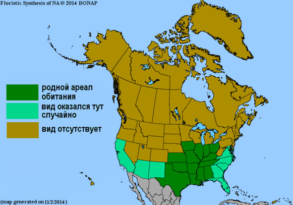 Ареал пекана (Carya illinoinensis). Kartesz, J.T., The Biota of North America Program (BONAP). 2015. Taxonomic Data Center. (http://www.bonap.net/tdc). Chapel Hill, N.C.