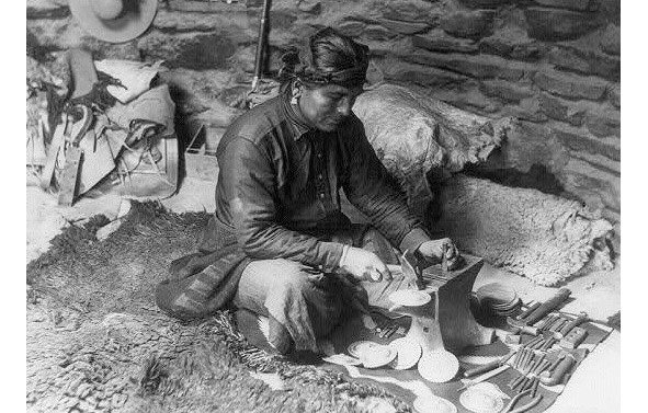 С серебром индейцы Юго-Запада познакомились довольно давно. Они с удовольствием носили блестящие украшения, добытые в качестве трофеев во время военных рейдов на мексиканцев или же купленные у них в мирное время. В начале прошлого века О. Липс предположил, что искусству работы с благородным металлом навахо научились еще от испанцев, примерно в XVII в. [8, p. 92] Однако, это не так. На самом деле индейцы освоили обработку серебра только в резервационный период. Но история будет неполной, если мы не заглянем на несколько десятилетий, предшествующих этому времени. Предтечами ныне знаменитых краснокожих ювелиров были кузнецы. Уже в 1830-х гг. среди пуэбло были ремесленники, умевшие работать с железом и владеющие техникой художественной ковки меди и латуни. Зуни помнят имя своего первого кузнеца, который занимался в основном ремонтом топоров, мотыг и других сельскохозяйственных инструментов. Звали его Кивашинакве – Делатель Топоров. Если железо использовалось для изготовления утилитарных инструментов, то из желтых металлов индейцы научились делать простейшие украшения с примитивным орнаментом. Попавшие к ним медные чайники, котелки и сковородки шли на изготовление колец, браслетов и других украшений. Мексиканские торговцы даже стали специально поставлять индейцам медную проволоку для изготовления витых украшений и за хорошую цену покупали у мастеров пуэбло готовые изделия из желтого металла – кресты, кончо и др.