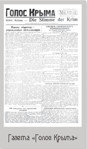 „.В 1941–1944 годах в оккупированном немецко-румынскими войсками Симферополе (население которого, если верить статистике оккупационных властей, на 1 февраля 1942 года составляло 89 691 человек4) Городским управлением массовым тиражом (от 3 до 80 тысяч экземпляров) издавалась профашистская газета «Голос Крыма». В общей сложности с 12 декабря 1941 года по 9 апреля 1944 года вышло 338 номеров. Поначалу газета выходила два раза в неделю на двух полосах, но в основном – три раза в неделю на четырех полосах. Ответственным редактором первого номера газеты был М.П.Поливанов, затем ее главными редакторами последовательно состояли В.В.Попов (декабрь 1941 – март 1942), А.И.Булдеев (март 1942 – октябрь 1943), К.А.Быкович (октябрь 1943 – апрель 1944).
