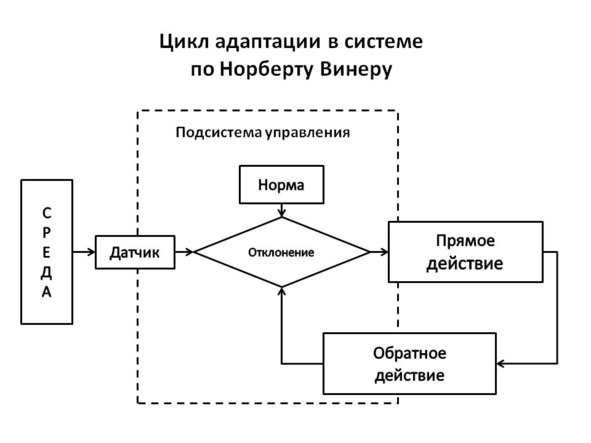 Ключевая новация этой работы состоит в представлении сути Жизни как процесса адаптации к Среде всех объектов живой материи – организмов, то есть приспособление3. На всякое изменение Среды любая адаптивная система приспосабливается к изменению путем своего изменения или воздействия на Среду (поведением), см. модель Норберта Винера [Винер Н. (2001/1948)], рис. 1.