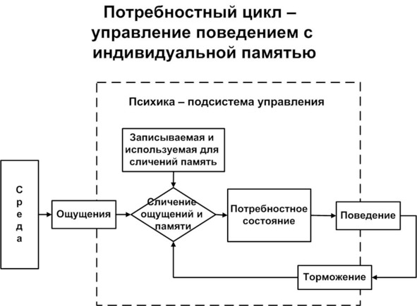 В рамках нового подхода – потребности есть внутренние досознательные (официально – «подсознательные») психофизиологические состояния у Животных и даже у Человека. Каждая потребность есть внутреннее напряжение, которое отражает необходимость адаптации поведением, выбираемым из памяти. В отсутствие полезной памяти или непригодности известного поведения потребностное состояние непроизвольно вызывает хаотическое поисковое поведение. Механизм древний, но он обязательно является процессом управления поведением и строится как первое средство обучения и записи в память для последующего использования информации в идентичных ситуациях5.