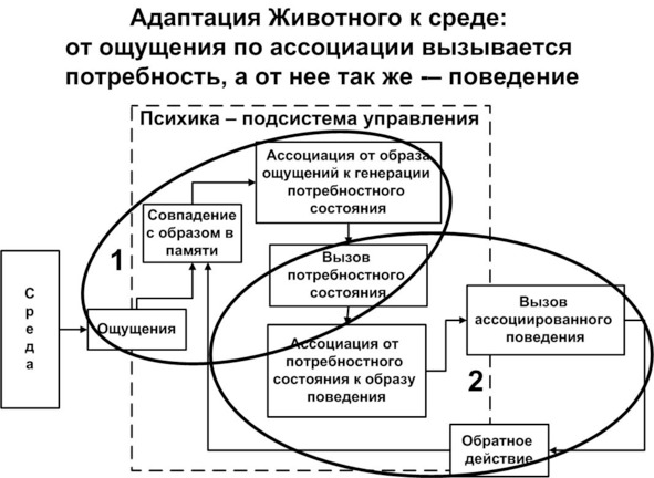 Система памяти животных построена на ассоциациях последовательностей воспринимаемых событий внешних и собственных ощущений S (enses) и восприятий целых комплексов ощущений S (ense perception), включая и сами потребностные состояния – возбуждения N (eed) или их снятия not N (eed). Кроме того, психика Животных (на подсознании, то есть автоматически) записывает важные поведения A (ction) как поведения, снимающие потребность или вызывающие полезные для Жизни потребности. Так записываются состояния приближающейся опасности, или подвернувшиеся ситуации пользы (для Жизни).