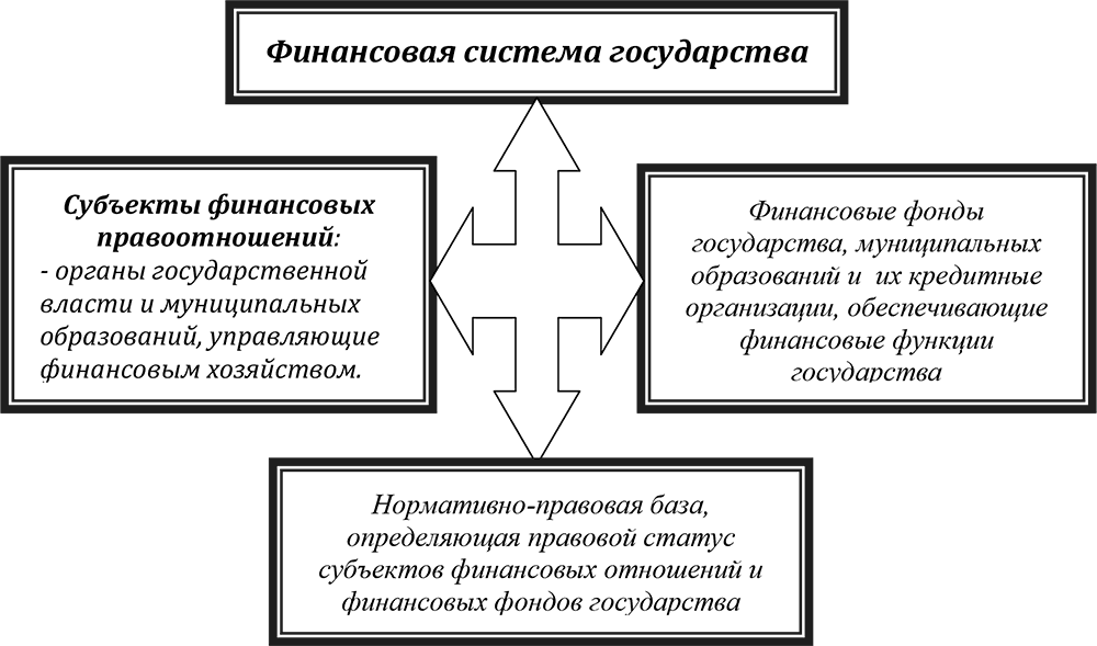По мнению авторов, не одно из представленных и существующих в юридической и экономической литературе определений и понятий «финансовая система», не дает истинного представления об этой категории, ибо не содержит в себе главного элемента – совокупности правовых норм, регулирующих финансовые отношения и правовой статус субъектов этих отношений. Как представляется, в узком смысле, финансовую систему следует рассматривать как совокупность правовых норм, регулирующих финансовую деятельность государства и органов публичной власти, составляющих механизм государственного управления финансовым хозяйством страны. Более широко, под финансовой системой государства следует понимать совокупность финансовых институтов государства (органов государственной власти, представляющих механизм финансового управления), бюджетных и внебюджетных фондов, кредитных учреждений государства и муниципальных образований, а так же правовых норм, закрепляющих правовой статус субъектов финансовых отношений и движения денежных средств государства, его субъектов и муниципальных образований.