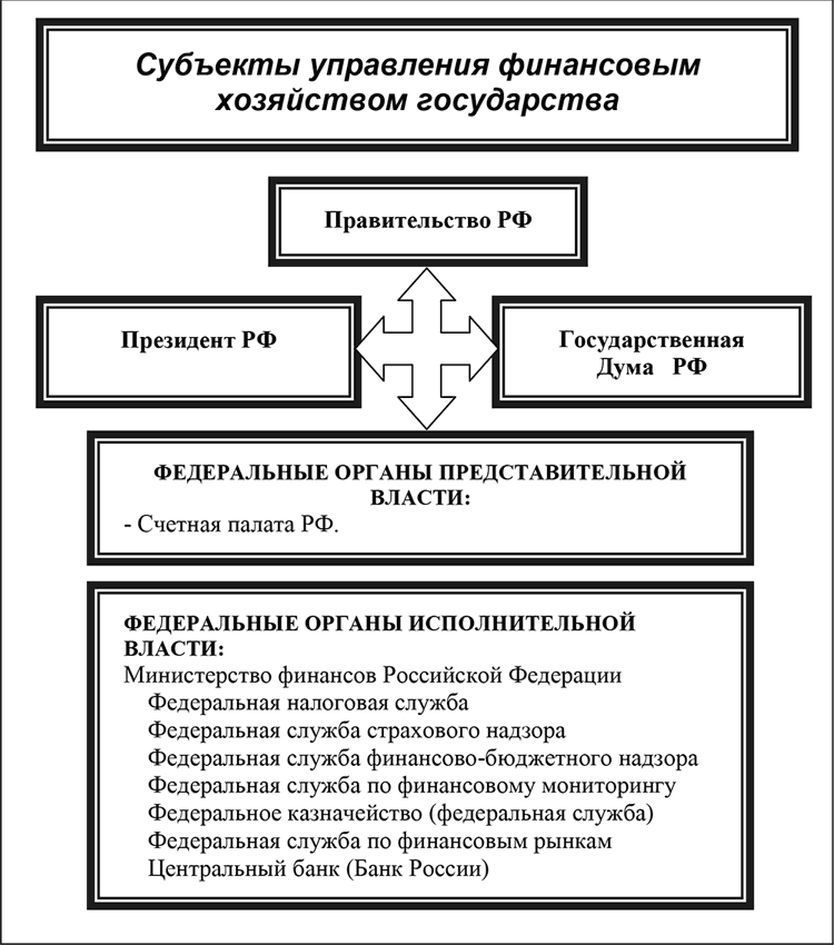 Особая роль в финансовой деятельности государства отводится субъектам ее управления. Это государственные органы законодательной и исполнительной ветвей власти и должностные лица государства, уполномоченные осуществлять регулирование финансовых отношений посредством издания и (или) применения правовых норм, обеспечивающих функции финансовых институтов государства, которых схематически можно представить следующим образом: