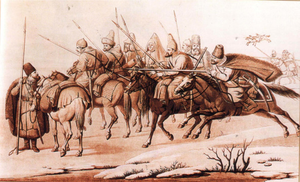 Башкиры в Берлине (Башкир. Унтер ден Линден. 11 марта 1813 г.). Худ. К. Л. Хюбейль. 1813 г. Фотокопия из Научного архива УНЦ РАН.