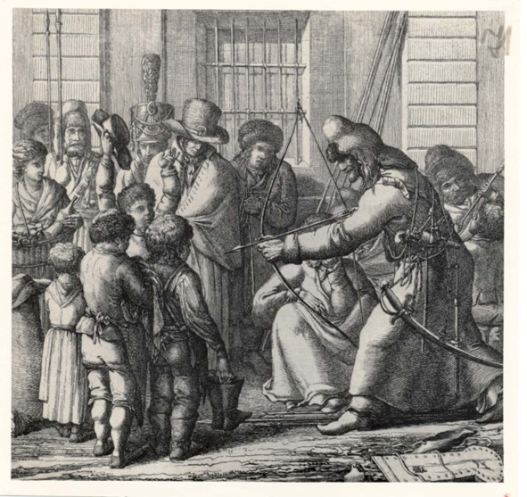 Первые казаки в Берлине 20 февраля 1813 г. (второй-четвёртый и седьмой слева – башкиры, пятая-башкирка в платке). Худ. И. Ф. Югель. 1813 г.