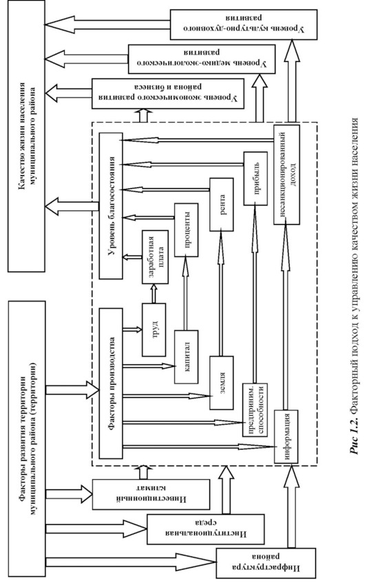 В англоязычных странах термин «корпорация» (от лат. corporation – объединение, сообщество) чаще всего, означает организационно-правовую форму бизнеса, которая предусматривает по сути, объединение факторов производства на условиях долевой собственности с передачей функций управления в руки верхнего эшелона профессиональных управляющих (менеджеров), работающих по найму. Принципиальное отличие модели корпоративного управления на государственном уровне заключается в том, что все факторы производства (труд, капитал, природные ресурсы, предпринимательские способности и информация) распределены между субъектами социально-экономических отношений, являющихся собственниками, и их использование в экономической деятельности связано с открывающимися возможностями получения новых источников доходов для их владельцев. В условиях развития корпоративных отношений в России уровень благосостояния населения определяется не только уровнем заработной платы, но, главным образом, реализацией факторов производства, находящихся в собственности, в социально-экономических процессах. Уровень благосостояния населения во многом зависят от величины доходов от вложенных капиталов в виде дивидендов или процентов, доходов от использования предпринимательских способностей, ренты и перечня несанкционированных доходов. Именно использование в экономической деятельности полного перечня факторов производства, находящихся в собственности, предполагает формирование тенденций существенного роста качества жизни населения. В качестве собственников на факторы производства могут выступать все субъекты социально-экономических отношений, в том числе, физические лица, коммерческие и некоммерческие предприятия, организации и учреждения, а также государство и муниципалитеты. Рассматриваемая факторная модель (рис.1.2) в системе управления показывает наличие на входе нескольких факторов, с помощью которых осуществляется управляющее административное воздействие на качество жизни населения [1]. Оценить прямыми количественными показателями управляющее воздействие, связанное с развитием инфраструктуры, институциональной среды и инвестиционного климата, сформированных на данной территории, невозможно. Но именно управляющее воздействие со стороны административных структур создает условия экономического, медико-экологического и культурно-духовного развития государства/муниципального района.